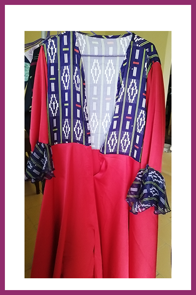Long robe rouge avec des motifs en pagne baoulé sur la poitrine et les manches